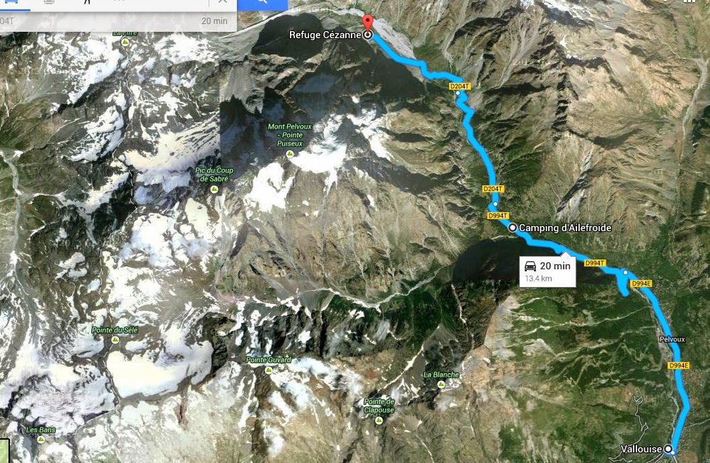 For our last full day with Mary and Tim we wanted to take them someplace special. We hadn't been up to the Pre de Madame Carle area up above Ailefroide but it was meant to be beautiful and there are a couple of climbs we wanted to see if we could locate. Here's a satellite image of the area from Vallouise up to Refuge Cezanne so you can see the sort of landscape we're talking about ...